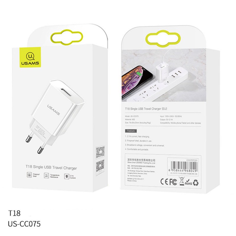Зарядно-адаптер за телефон Usams Т18 e oригинално и универсално зарядно за телефон на Usams, подходящо за всичко модели на iPhone, Samsung, Huawei, Xiaomi, Nokia, Motorola и други производители.