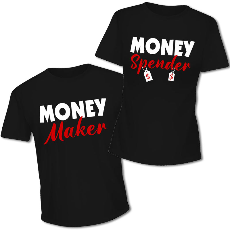 Супер забавна комбинация за всички влюбени, нашият комплект тениски за двойки-Money! Зарадвай половинката си с готин подарък без да чакаш Свети Валентин. Женска тениска "Money spender" и мъжка "Money maker". Тениските за двойки са 100% памук и се изпращат в рамките на работния ден.